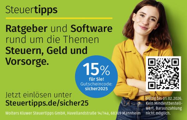 15% für Sie! Steuertipps | Ratgeber und Software rund um die Themen Steuern, Geld und Vorsorge. Mehr Details Endet in