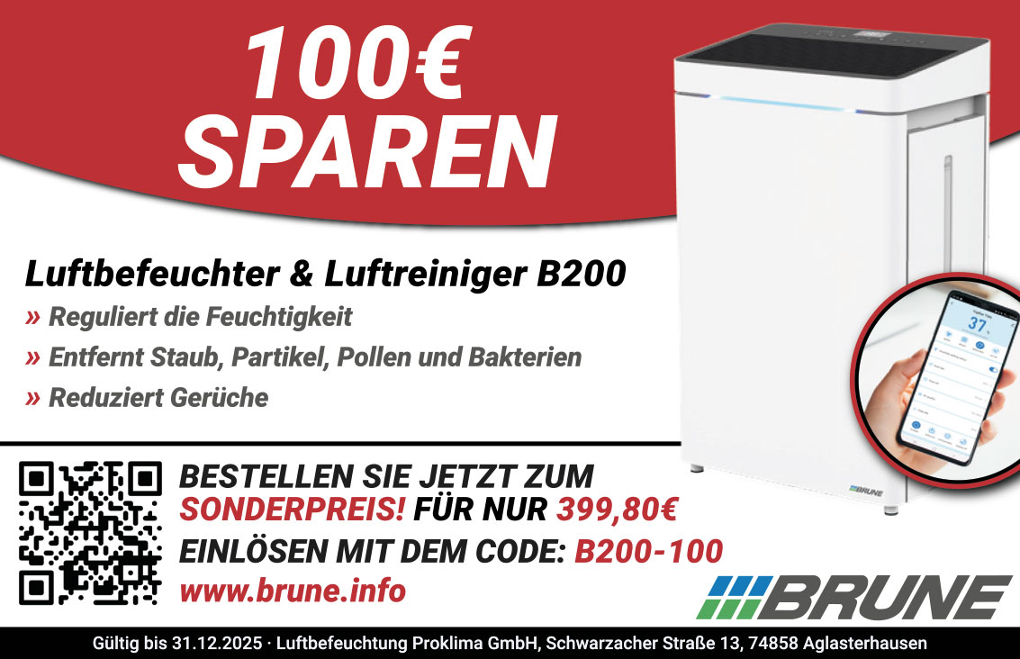 Luftbefeuchtung Proklima GmbH Startdatum07.11.2025 Ablaufdatum31.12.2025 100€ SPAREN - Luftbefeuchter & Luftreiniger B200 » Reguliert die Feuchtigkeit» Entfernt Staub, Partikel, Pollen und Bakterien» Reduziert GerücheBESTELLEN SIE JETZT ZUM SONDERPREIS! FÜR NUR 399,80€ Code B200-100 Couponcode kopieren Coupon einlösen Coupon drucken! Endet in