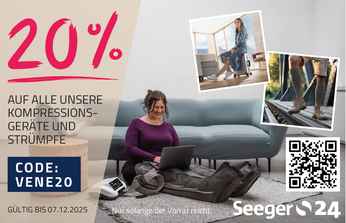 Seeger Startdatum13.11.2025 Ablaufdatum07.12.2025 20% AUF ALLE UNSERE KOMPRESSIONS-GERÄTE UND STRÜMPFE Code VENE20 Couponcode kopieren Coupon einlösen Coupon drucken! Endet in