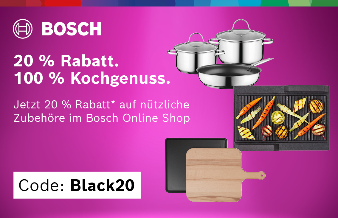 BOSCH Startdatum12.11.2025 Ablaufdatum09.01.2026 20% Rabatt. 100% Kochgenuss. Jetzt 20% Rabatt* auf nützliche Zubehöre im Bosch Online Shop #top Code Black20 Couponcode kopieren Coupon einlösen Coupon drucken! Endet in