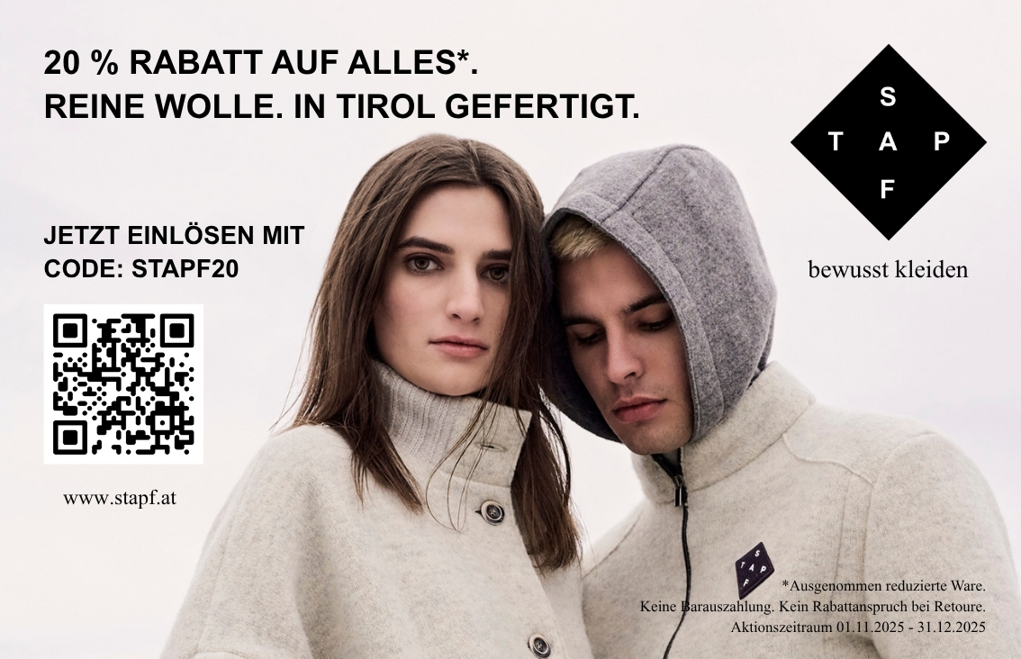 Stapf Startdatum13.11.2025 Ablaufdatum31.12.2025 20 % RABATT AUF ALLES*. REINE WOLLE. IN TIROL GEFERTIGT. Bewusst kleiden Code STAPF20 Couponcode kopieren Coupon einlösen Coupon drucken! Endet in