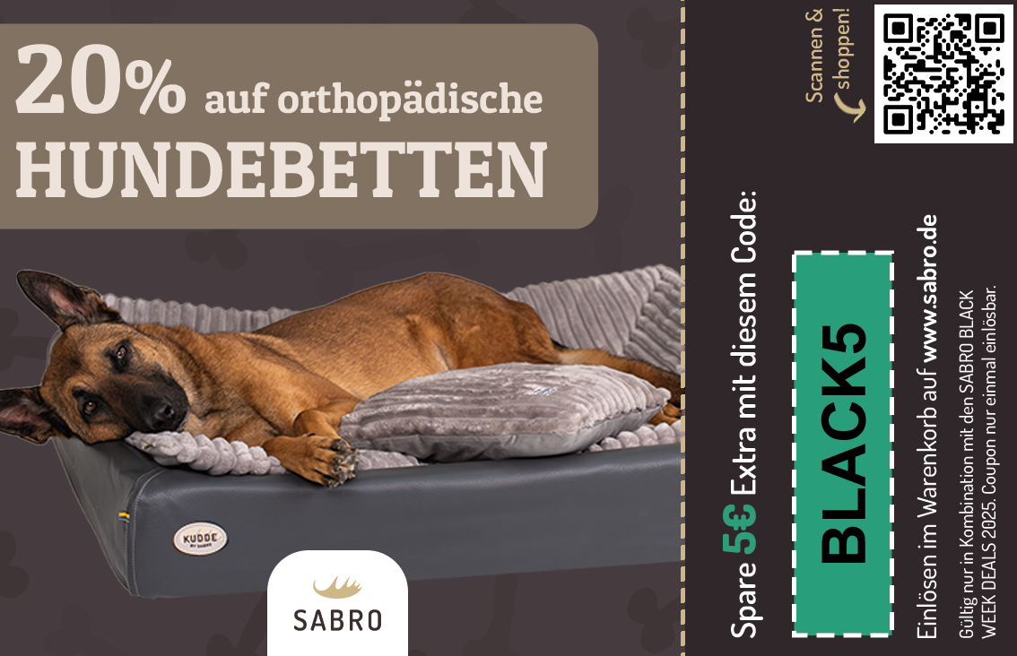 SABRO Startdatum14.11.2025 Ablaufdatum31.12.2025 20% Rabatt auf orthopädische HUNDEBETTEN | Spare 5€ Extra mit diesem Code: BLACK5 Code BLACK5 Couponcode kopieren Coupon einlösen Coupon drucken! Endet in