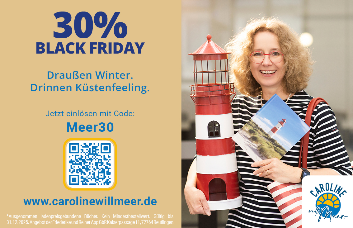 CAROLINE will Meer Startdatum19.11.2025 Ablaufdatum31.12.2025 30% BLACK FRIDAY | Draußen Winter. Drinnen Küstenfeeling. Code Meer30 Couponcode kopieren Coupon einlösen Coupon drucken! Endet in
