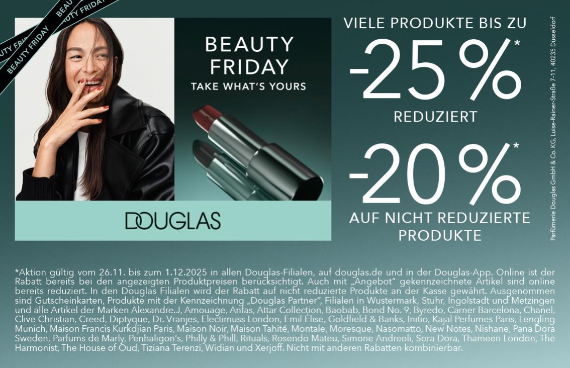 *Aktion gültig vom 26.11. bis zum 1.12.2025 in allen Douglas-Filialen, aut douglas.de und in der Douglas-App. Online ist der Rabatt bereits bei den angezeigten Produktpreisen berücksichtigt. Auch mit Angebot" gekennzeichnete Artikel sind online bereits reduziert. In den Douglas Filialen wird der Rabatt auf nicht reduzierte Produkte an der Kasse gewährt. Ausgenommen sınd Gutscheinkarten, Produkte mit der Kennzeichnung Douglas Partner", Filialen in Wustermark, Stuhr, Ingolstadt und Metzingen und alle Artikel der Marken Alexandre., Amouage, Antas, Attar Collection, Baobab, Bond No. 9, Byredo, Carner Barcelona, Chanel, Clive Christian, Creed, Diptyque, Dr. Vranjes, Electimuss London, Emil Elise, Goldtield & Banks, Initio, Kajal Pertumes Paris, Lengling Munich, Maison Francis Kurkajian Paris, Maison Noir, Maison Tahité, Montale, Moresque, Nasomatto, New Notes, Nishane, Pana Dora Sweden, Partums de Marly, Penhaligon's, Philly & Phill, Rituals, Rosendo Mateu, Simone Andreoli, Sora Dora, Thameen London, The Harmonist, The House of Oud, Tiziana Terenzi, Widian und Xerjoff. Nicht mit anderen Rabatten kombinierbar.