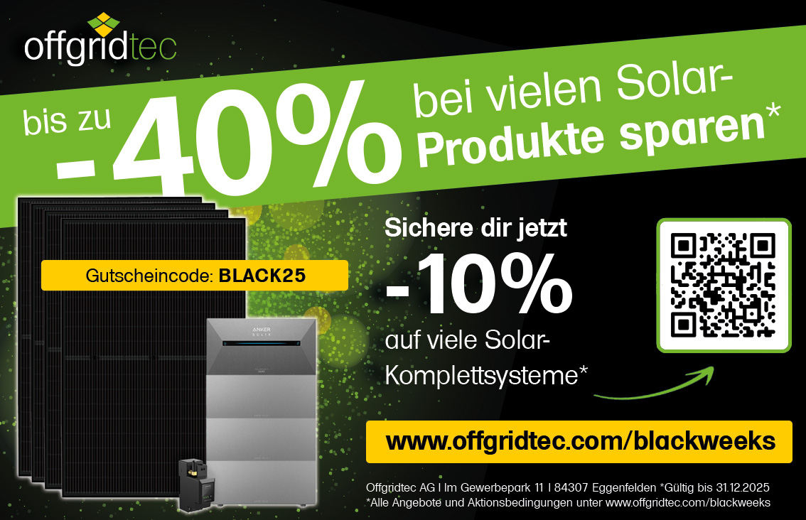 Offgridtec AG Startdatum20.11.2025 Ablaufdatum31.12.2025 bis zu 40% bei vielen Solar Produkten sparen #hausundgarten Code BLACK25 Couponcode kopieren Coupon einlösen Coupon drucken! Endet in
