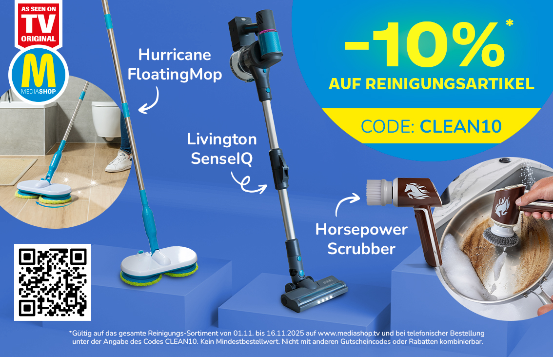 *Gültig auf das gesamte Reinigungs-Sortiment von 01.11. bis 16.11.2025 auf www.mediashop.tv und bei telefonischer Bestellung unter der Angabe des Codes CLEAN10. Kein Mindestbestellwert. Nicht mit anderen Gutscheincodes oder Rabatten kombinierbar.