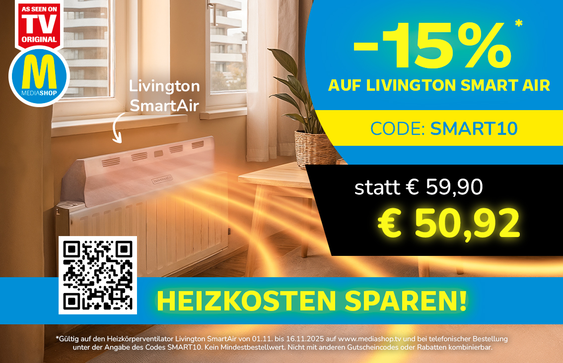 *Gültig auf den Heizkörperventilator Livington SmartAir von 01.11. bis 16.11.2025 auf www.mediashop.tv und bei telefonischer Bestellung unter der Angabe des Codes SMART10. Kein Mindestbestellwert. Nicht mit anderen Gutscheincodes oder Rabatten kombinierbar.