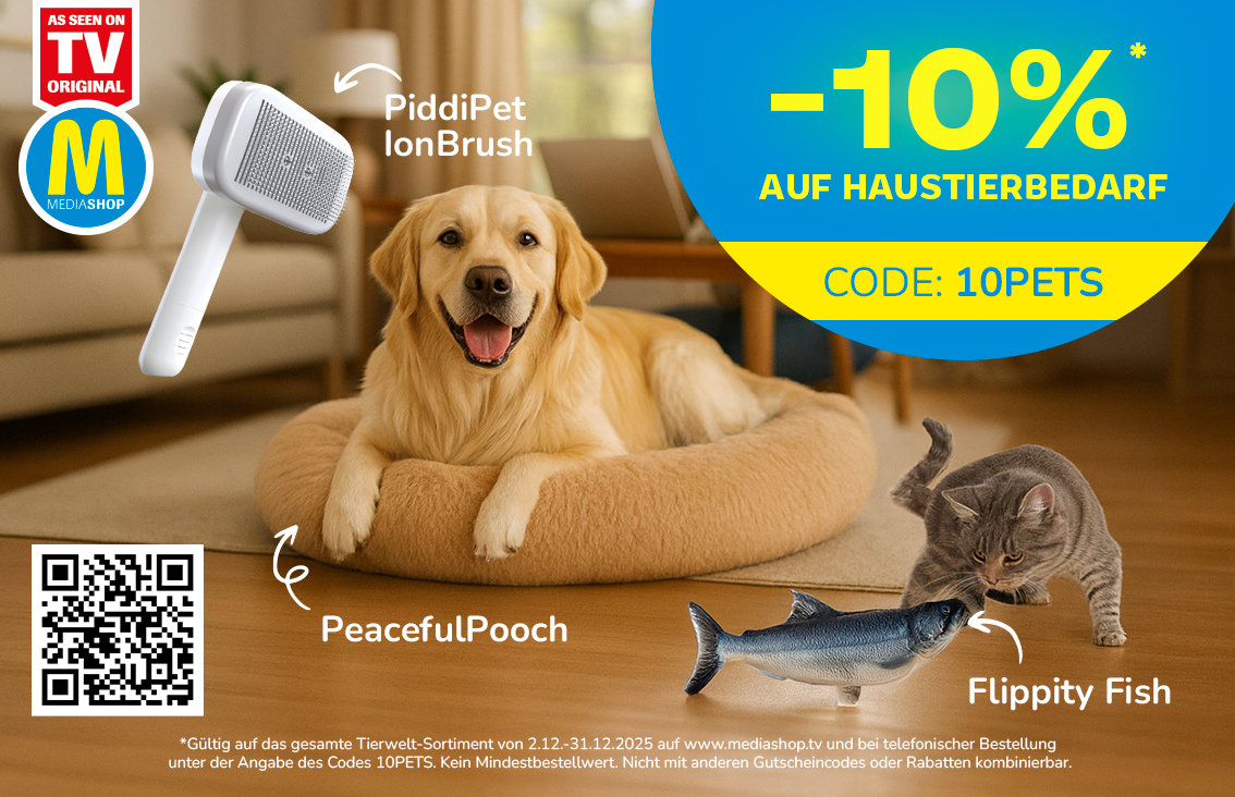 *Gültig auf das gesamte Tierwelt-Sortiment von 02.12. bis 31.12.2025 auf www.mediashop.tv und bei telefonischer Bestellung unter der Angabe des Codes 10PETS. Kein Mindestbestellwert. Nicht mit anderen Gutscheincodes oder Rabatten kombinierbar.