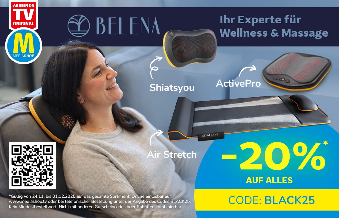 *Gültig von 24.11. bis 01.12.2025 auf das gesamte Sortiment. Online einlösbar auf www.mediashop.tv oder bei telefonischer Bestellung unter der Angabe des Codes BLACK25. Kein Mindestbestellwert. Nicht mit anderen Gutscheincodes oder Rabatten kombinierbar.