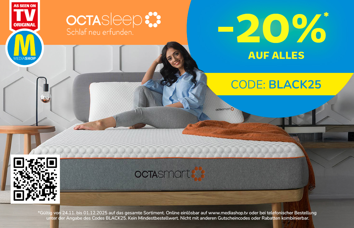 *Gültig von 24.11. bis 01.12.2025 auf das gesamte Sortiment. Online einlösbar auf www.mediashop.tv oder bei telefonischer Bestellung unter der Angabe des Codes BLACK25. Kein Mindestbestellwert. Nicht mit anderen Gutscheincodes oder Rabatten kombinierbar.