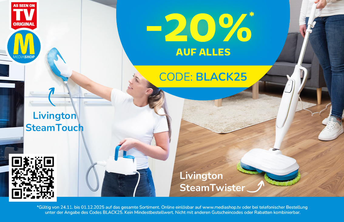 *Gültig von 24.11. bis 01.12.2025 auf das gesamte Sortiment. Online einlösbar auf www.mediashop.tv oder bei telefonischer Bestellung unter der Angabe des Codes BLACK25. Kein Mindestbestellwert. Nicht mit anderen Gutscheincodes oder Rabatten kombinierbar.
