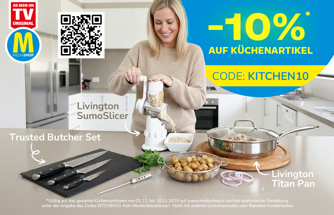 *Gültig auf das gesamte Küchensortiment von 01.11. bis 16.11.2025 auf www.mediashop.tv und bei telefonischer Bestellung unter der Angabe des Codes KITCHEN10. Kein Mindestbestellwert. Nicht mit anderen Gutscheincodes oder Rabatten kombinierbar.