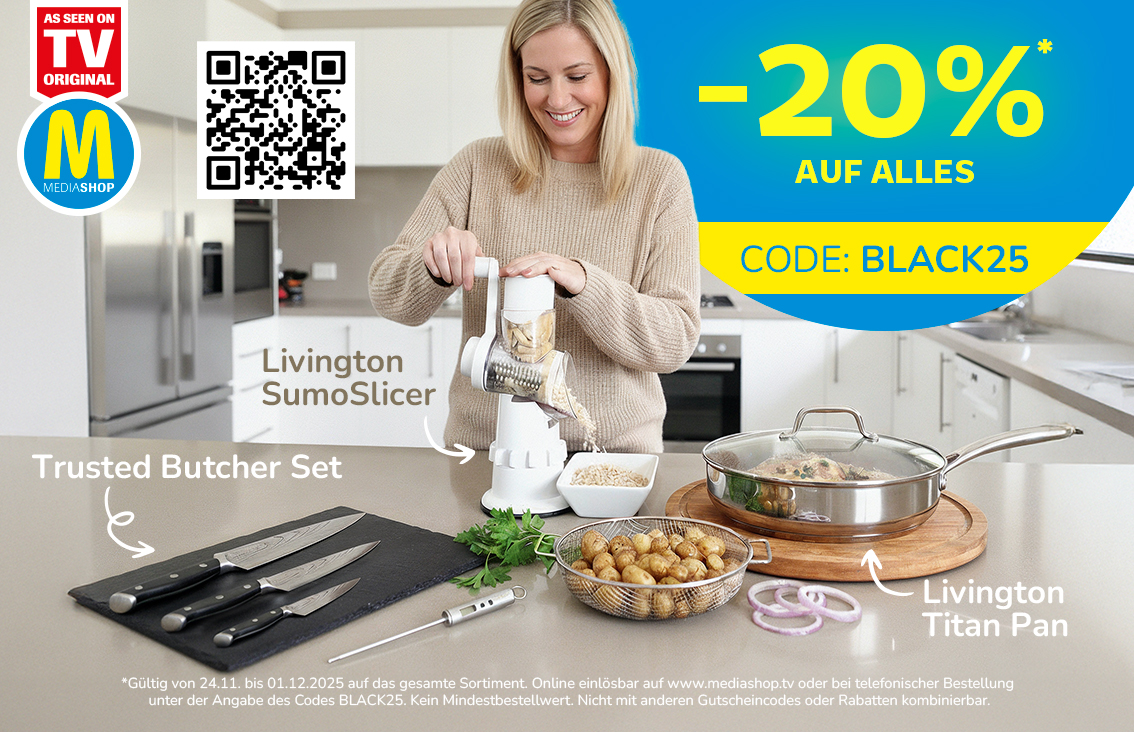 *Gültig von 24.11. bis 01.12.2025 auf das gesamte Sortiment. Online einlösbar auf www.mediashop.tv oder bei telefonischer Bestellung unter der Angabe des Codes BLACK25. Kein Mindestbestellwert. Nicht mit anderen Gutscheincodes oder Rabatten kombinierbar.