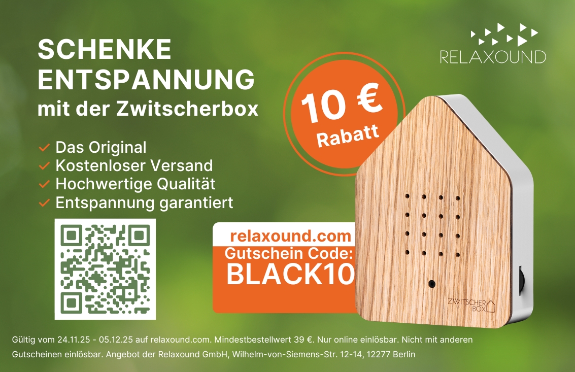 Relaxound GmbH Startdatum24.11.2025 Ablaufdatum05.12.2025 10 € Rabatt | SCHENKE ENTSPANNUNG mit der Zwitscherbox Das OriginalKostenloser VersandHochwertige QualitätEntspannung garantiert Code BLACK10 Couponcode kopieren Coupon einlösen Coupon drucken!