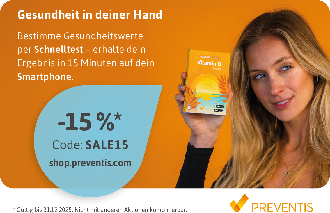 Preventis Startdatum11.11.2025 Ablaufdatum31.12.2025 -15%* RABATT | Gesundheit in deiner Hand Bestimme Gesundheitswerte per Schnelltest - erhalte dein Ergebnis in 15 Minuten auf dein Smartphone. Code SALE15 Couponcode kopieren Coupon einlösen Coupon drucken! Endet in