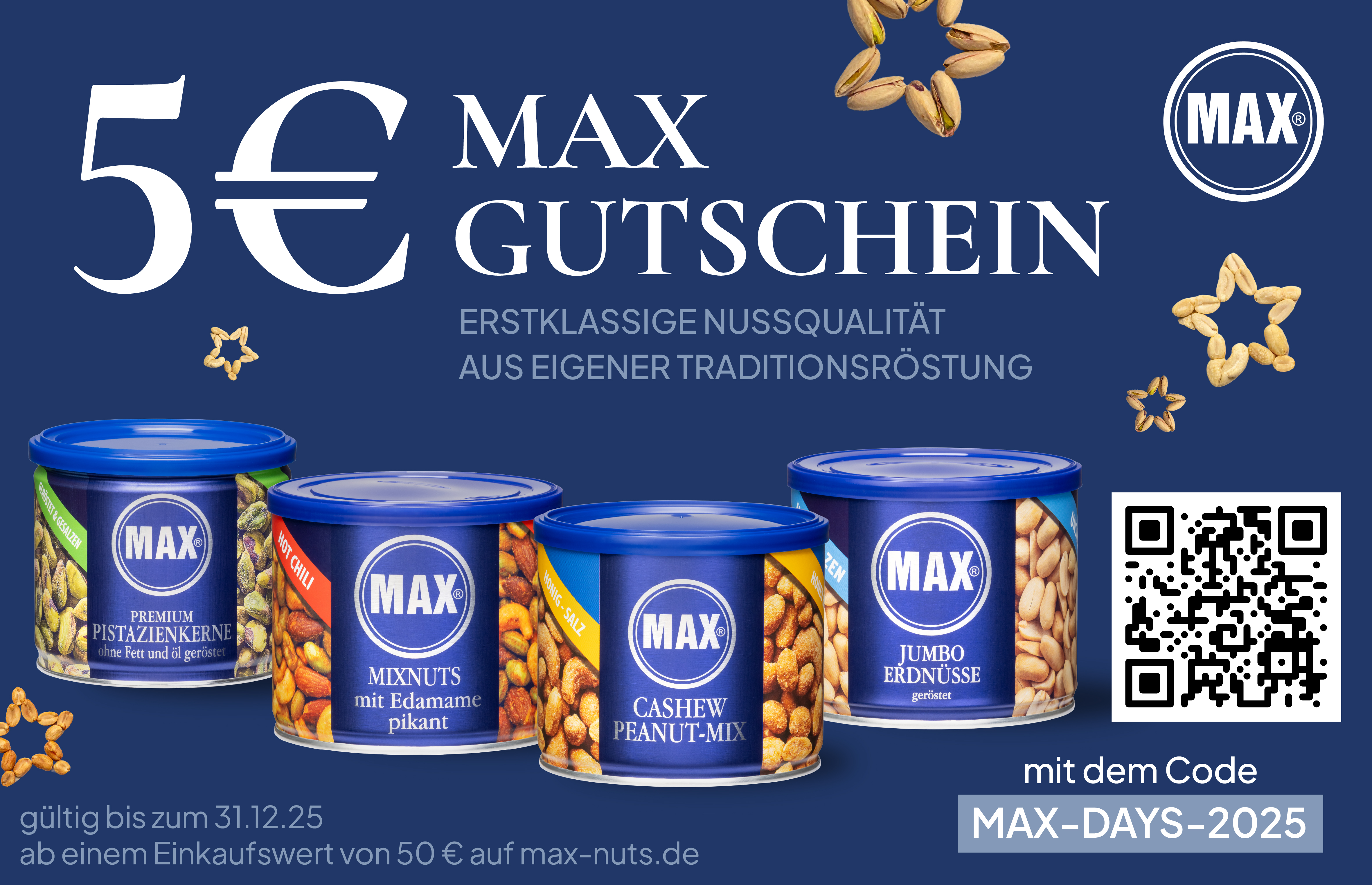Entdecke die höchste Qualität bei Nüssen und den einzigartigen MAX Geschmack - von Pistazien und Cashews über die weltweit beste Macadamia bis zu gewürzten Nussmischungen und gesalzenen Erdnüssen. Sichere dir den exklusiven Gutschein-Deal und erlebe einzigartige Genussmomente in der Weihnachtszeit mit wohltuenden Snacks - aus eigener MAX Traditionsröstung.