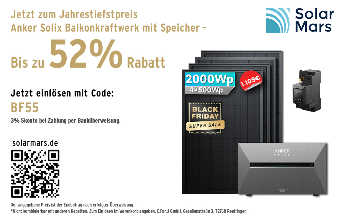 Solar Mars Startdatum20.11.2025 Ablaufdatum31.12.2025 Bis zu 52% Rabatt | Jetzt zum Jahrestiefstpreis | Anker Solix Balkonkraftwerk mit Speicher 3% Skonto bei Zahlung per Banküberweisung. Code BF55 Couponcode kopieren Coupon einlösen Coupon drucken! Endet in