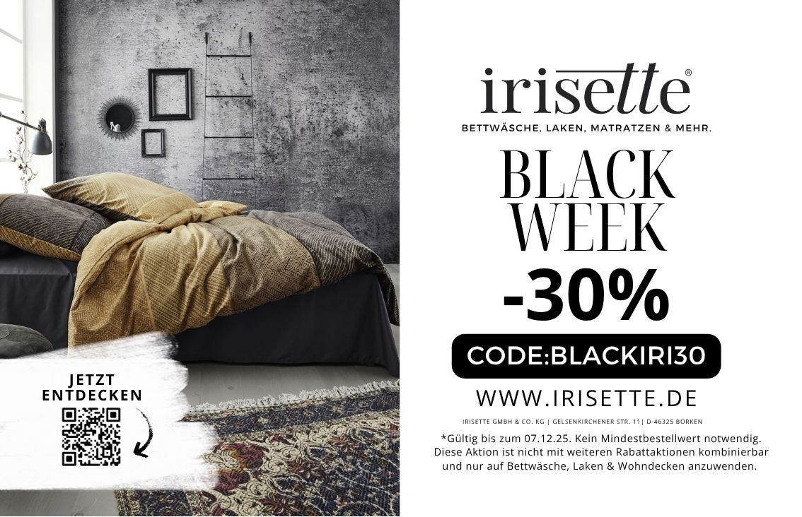 irisette Startdatum07.11.2025 Ablaufdatum07.12.2025 BLACK WEEK -30% RABATT bei irisette Code BLACKIRI3O Couponcode kopieren Coupon einlösen Coupon drucken! Endet in