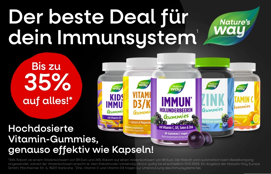 Nature's Way Startdatum07.11.2025 Ablaufdatum31.12.2025 Der beste Deal für deine Gesundheit. Nature's Way Bis zu 35% auf alles!* Hochdosierte Vitamin-Gummies, genauso effektiv wie Kapseln! Kein Code notwendig Zum Angebot Coupon drucken! Endet in