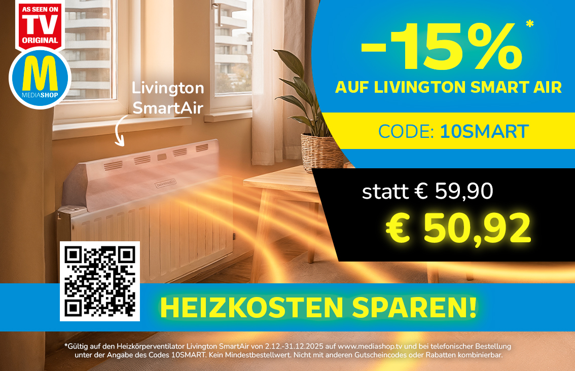 *Gültig auf den Heizkörperventilator Livington SmartAir von 02.12. bis 31.12.2025 auf www.mediashop.tv und bei telefonischer Bestellung unter der Angabe des Codes 10SMART. Kein Mindestbestellwert. Nicht mit anderen Gutscheincodes oder Rabatten kombinierbar.