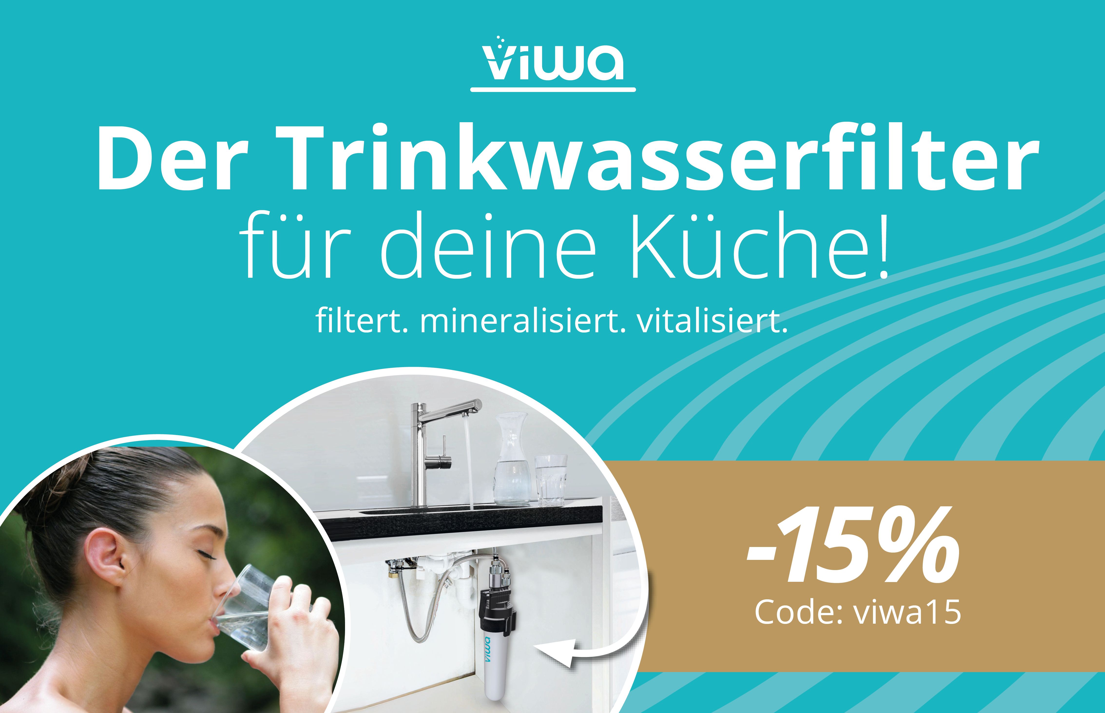 *Gilt nur einmalig pro Kunde. Gültig für Filter, Filtereinsätze und die erste Abo-Lieferung. Nicht kombinierbar mit anderen Aktionen. Änderungen vorbehalten. Angebot gültig bis 14.12.2025. Stand: November 2025. Preise inkl. gesetzl. MwSt., zzgl. Versand. Der angegebene Rabatt bezieht sich auf den niedrigsten Preis der letzten 30 Tage gemäß § 11 PAngV. Es gelten die gesetzlichen Widerrufsrechte. Grundpreise siehe Produktseite. Datenschutzhinweise und Teilnahmebedingungen unter viwa-wasser.de. Anbieter: perma-trade Wassertechnik GmbH, Röntgenstraße 2, 71229 Leonberg. Code viwa15