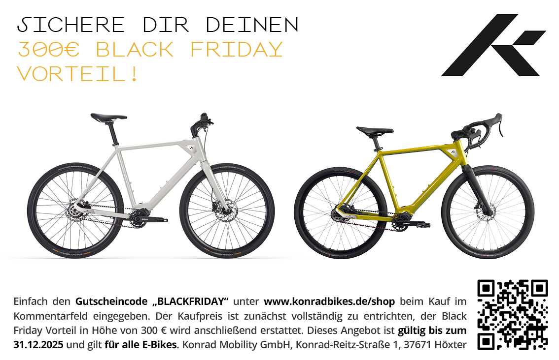 Einfach den Gutscheincode „BLACKFRIDAY“ unter www.konradbikes.de/shop beim Kauf im Kommentarfeld eingegeben. Der Kaufpreis ist zunächst vollständig zu entrichten, der Black Friday Vorteil in Höhe von 300 € wird anschließend erstattet. Dieses Angebot ist gültig bis zum 31.12.2025 und gilt für alle E-Bikes. Konrad Mobility GmbH, Konrad-Reitz-Straße 1, 37671 Höxter